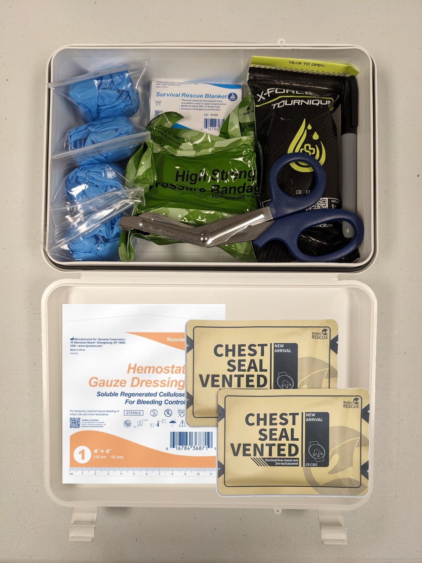 Description Qty Nitrile Gloves 2 pair 4 Thermal Blanket 1 Hemorrhage Control Bandage 4in 1 Emergency Trauma Shears 1 Permanent Marker 1 XForce Tourniquet 1 Plastic Gasket Case 1 Chest Seal Vent 2 pack 1 Hemostatic Gauze 1